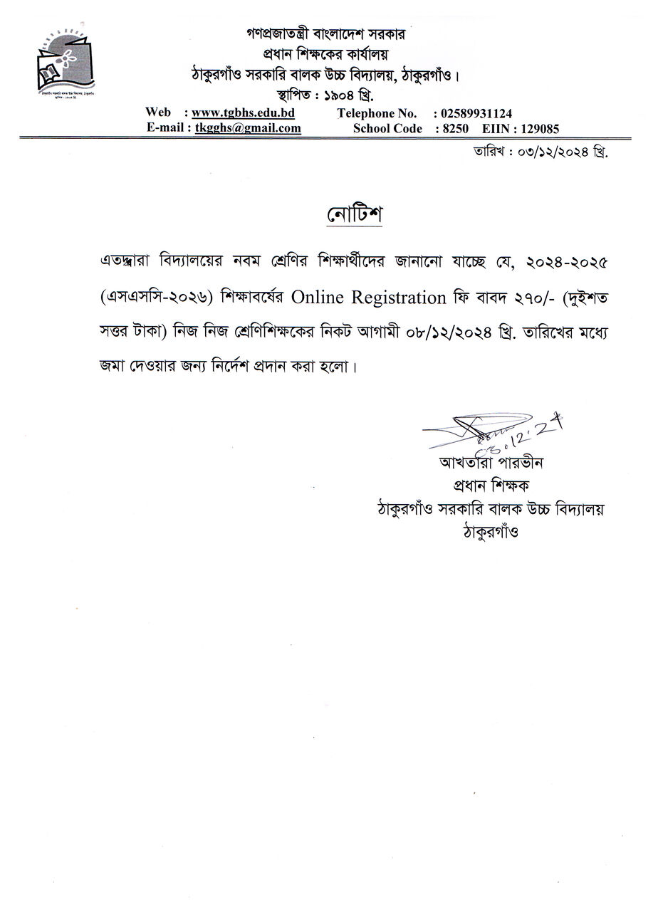 ২০২৪-২০২৫ (এসএসসি-২০২৬) শিক্ষাবর্ষের ৯ম শ্রেণির শিক্ষার্থীদের ON-LINE রেজিষ্ট্রেশন ফি জমাদান সংক্রান্ত নোটিশ
