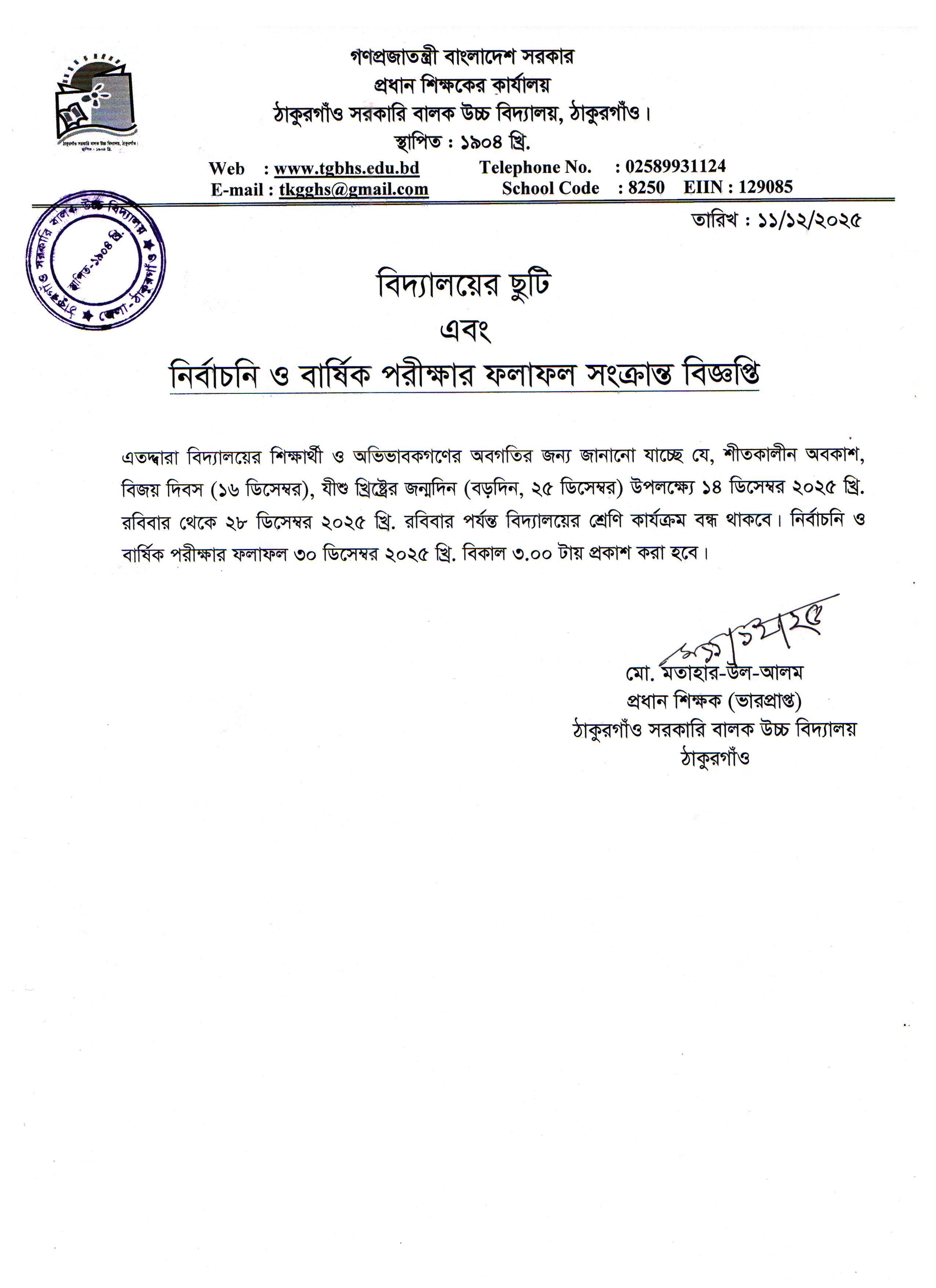 বিদ্যালয়ের ছুটি এবং নির্বাচনি ও বার্ষিক পরীক্ষার ফলাফল সংক্রান্ত বিজ্ঞপ্তি