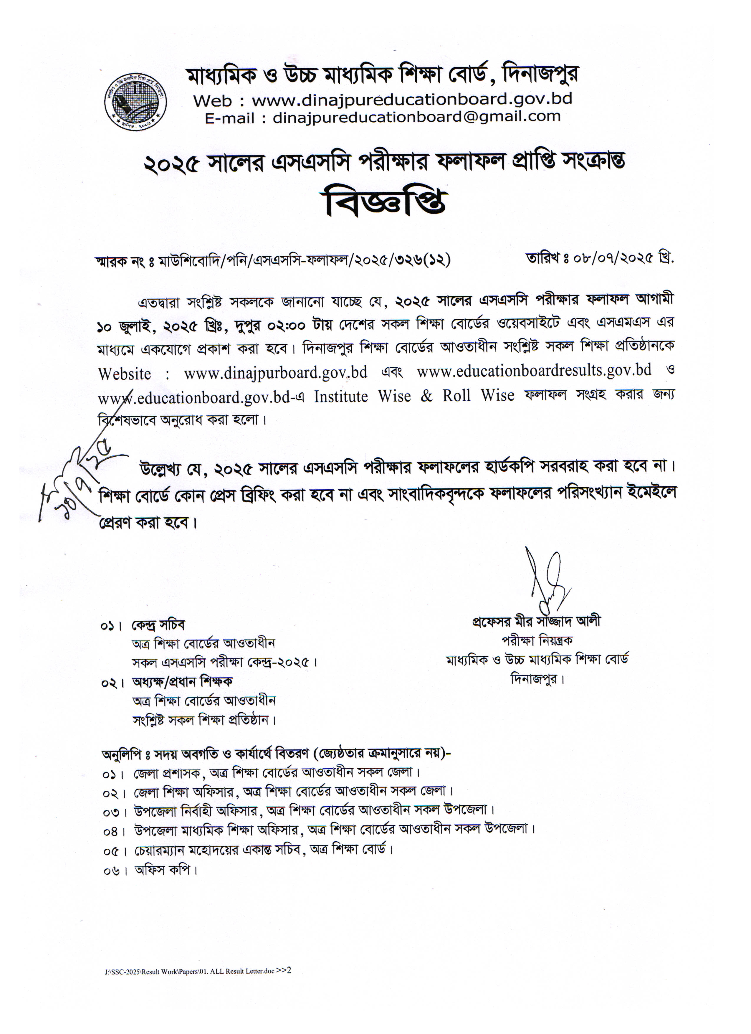 এসএসসি পরীক্ষা ২০২৫ এর ফলাফল প্রকাশ সংক্রান্ত নোটিশ