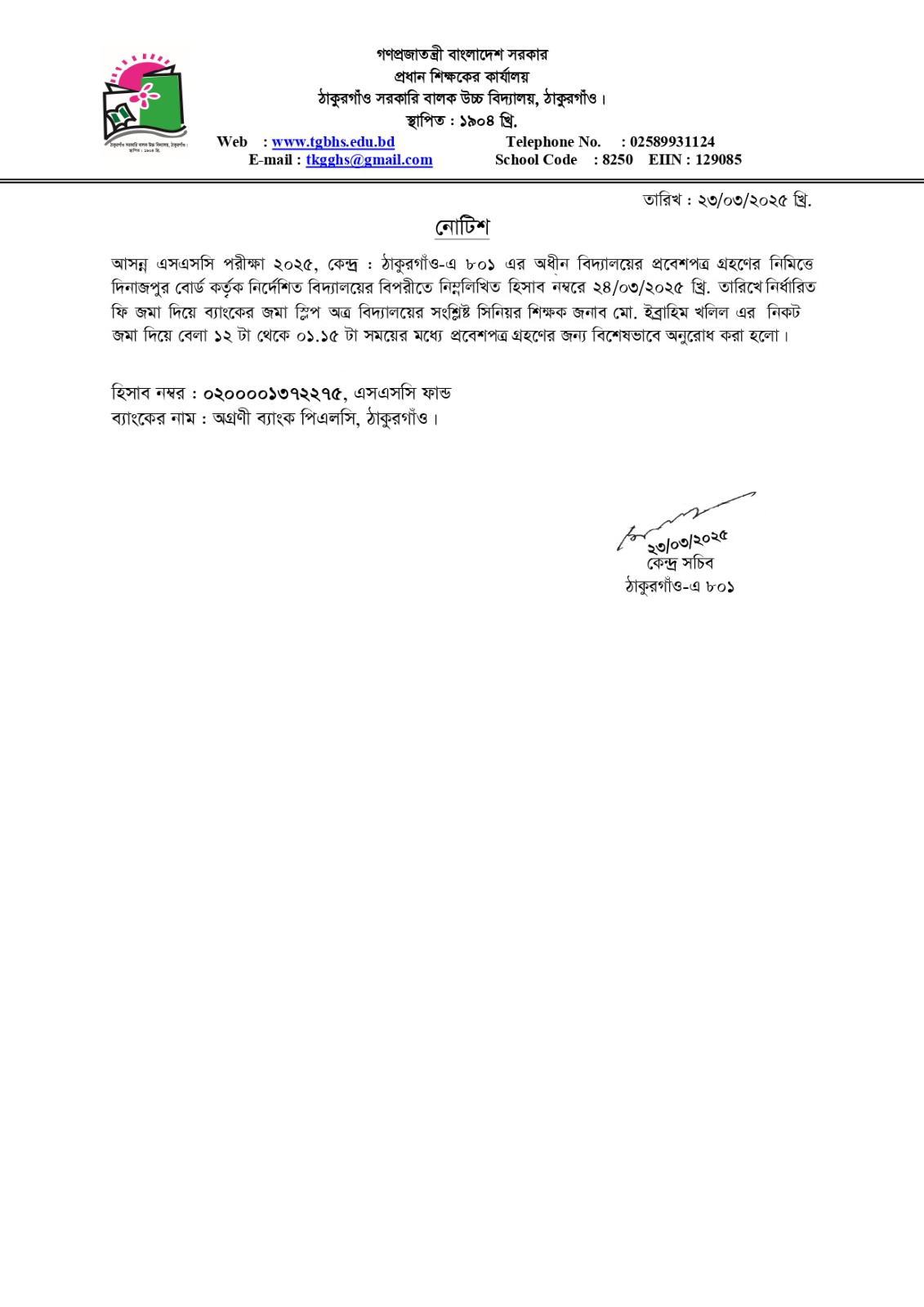 এসএসসি পরীক্ষা ২০২৫ ( কেন্দ্র : ঠাকুরগাঁও-এ ৮০১ এর অধীন বিদ্যালয়ের প্রবেশপত্র গ্রহণের নিমিত্তে ফি প্রদান সংক্রান্ত নোটিশ