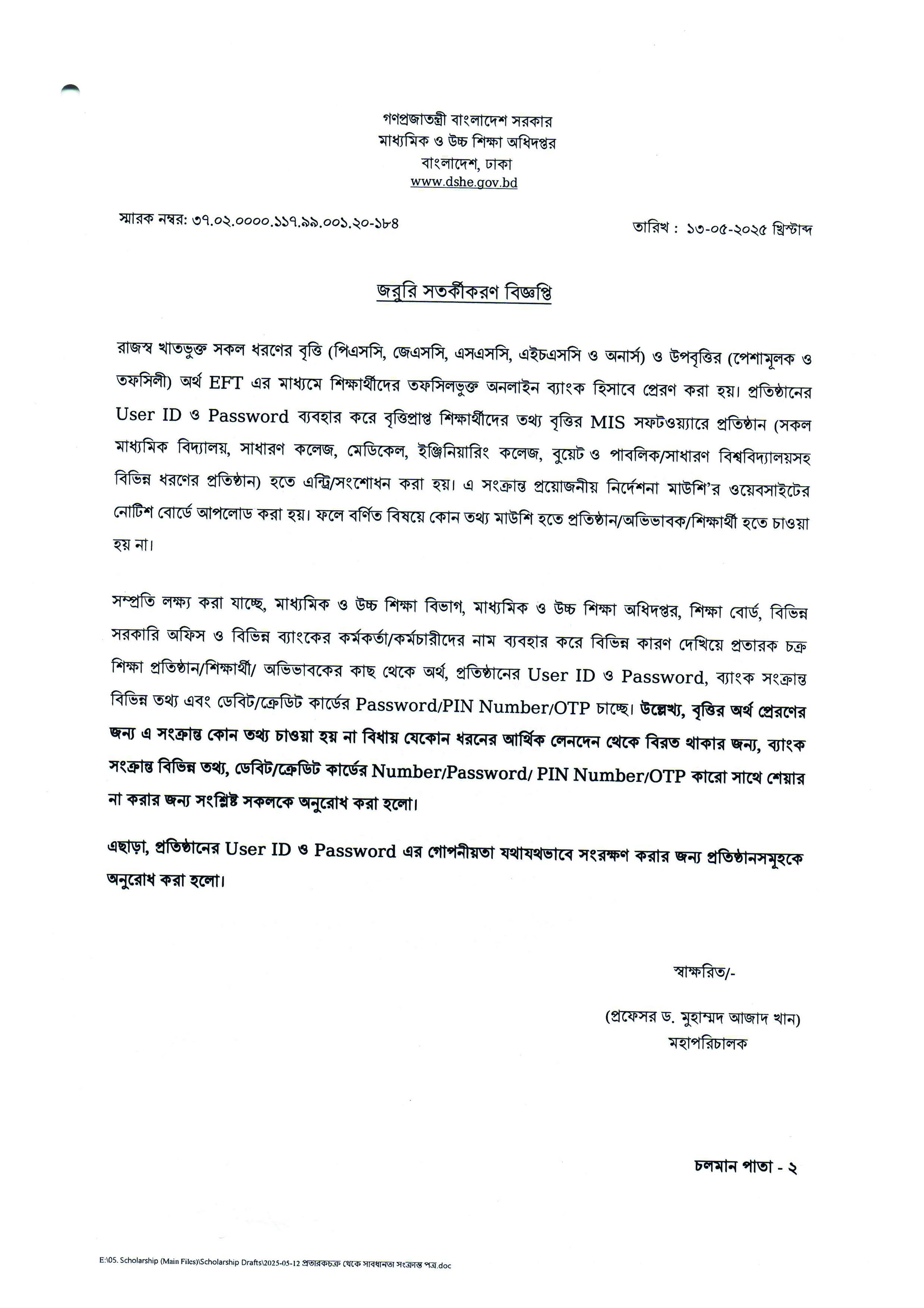 জরুরী সতর্কীকরণ (বৃত্তি সংক্রান্ত)