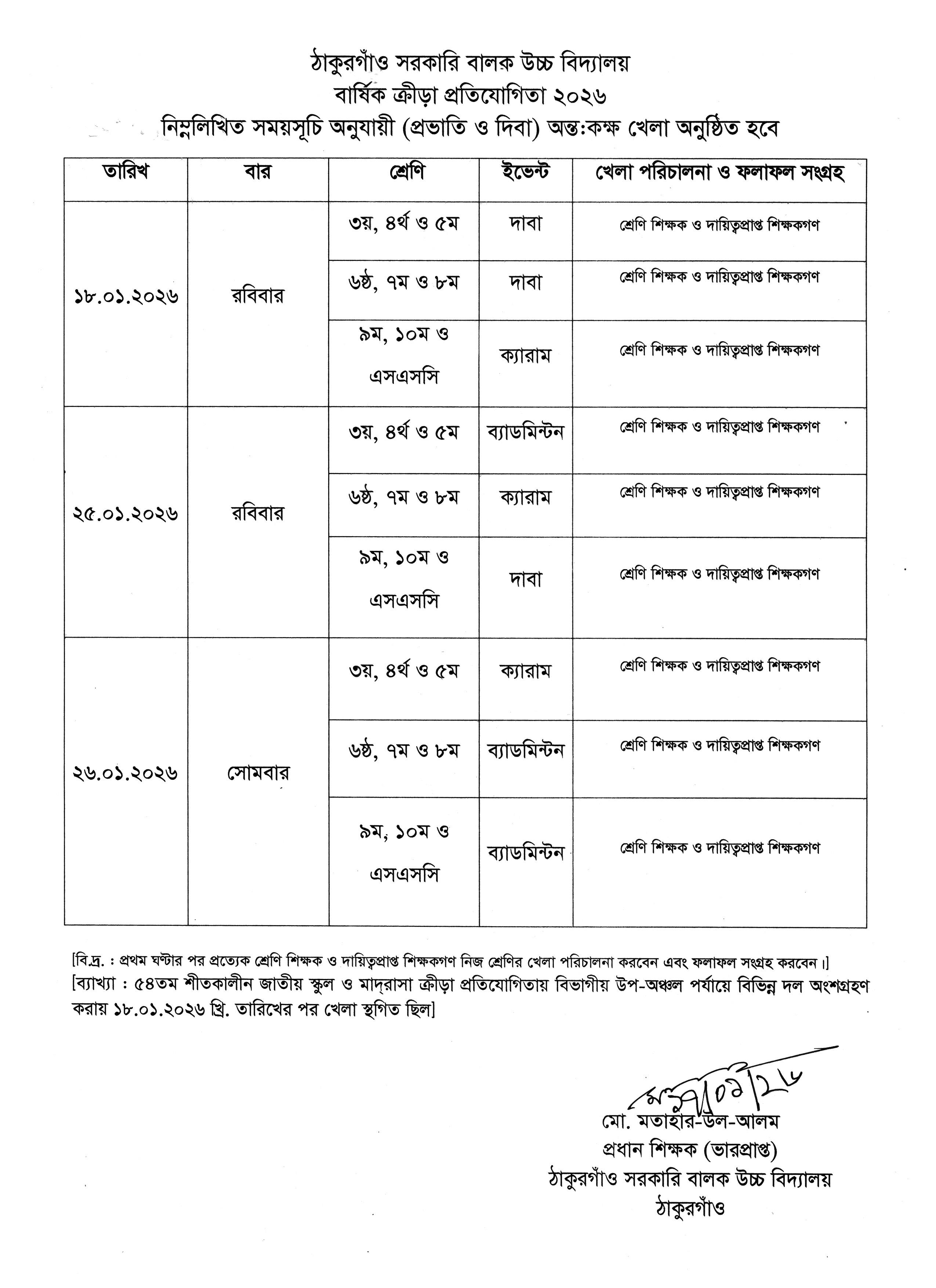 প্রভাতি ও দিবা শিফটের অন্তঃকক্ষ খেলা ২০২৬ এর সময়সূচি