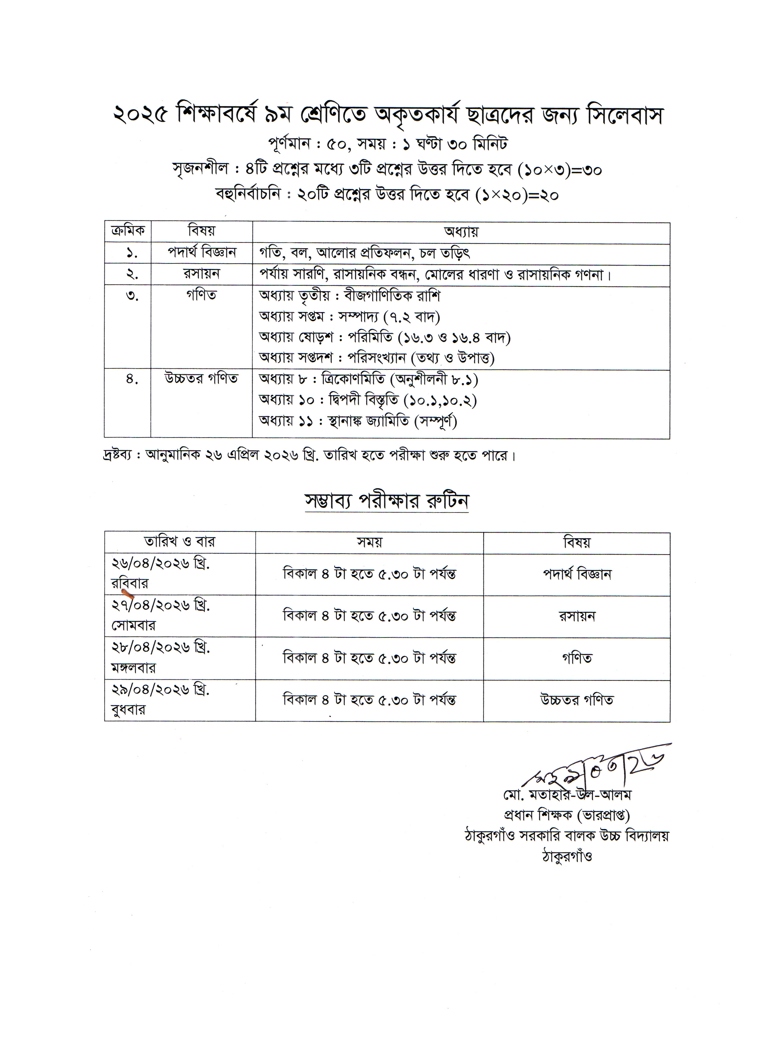 ২০২৫ শিক্ষাবর্ষে ৯ম শ্রেণিতে অকৃতকার্য ছাত্রদের জন্য সিলেবাস