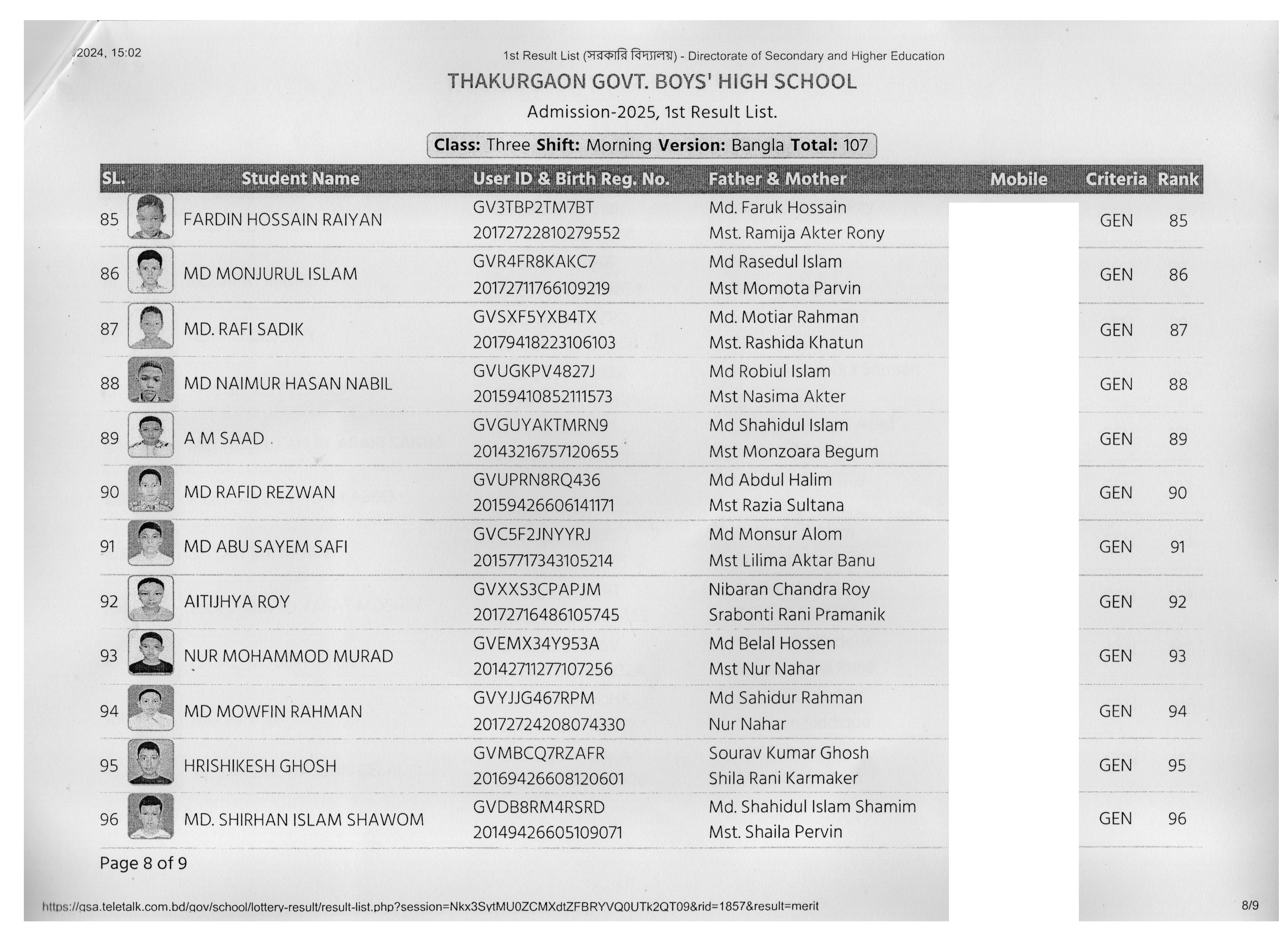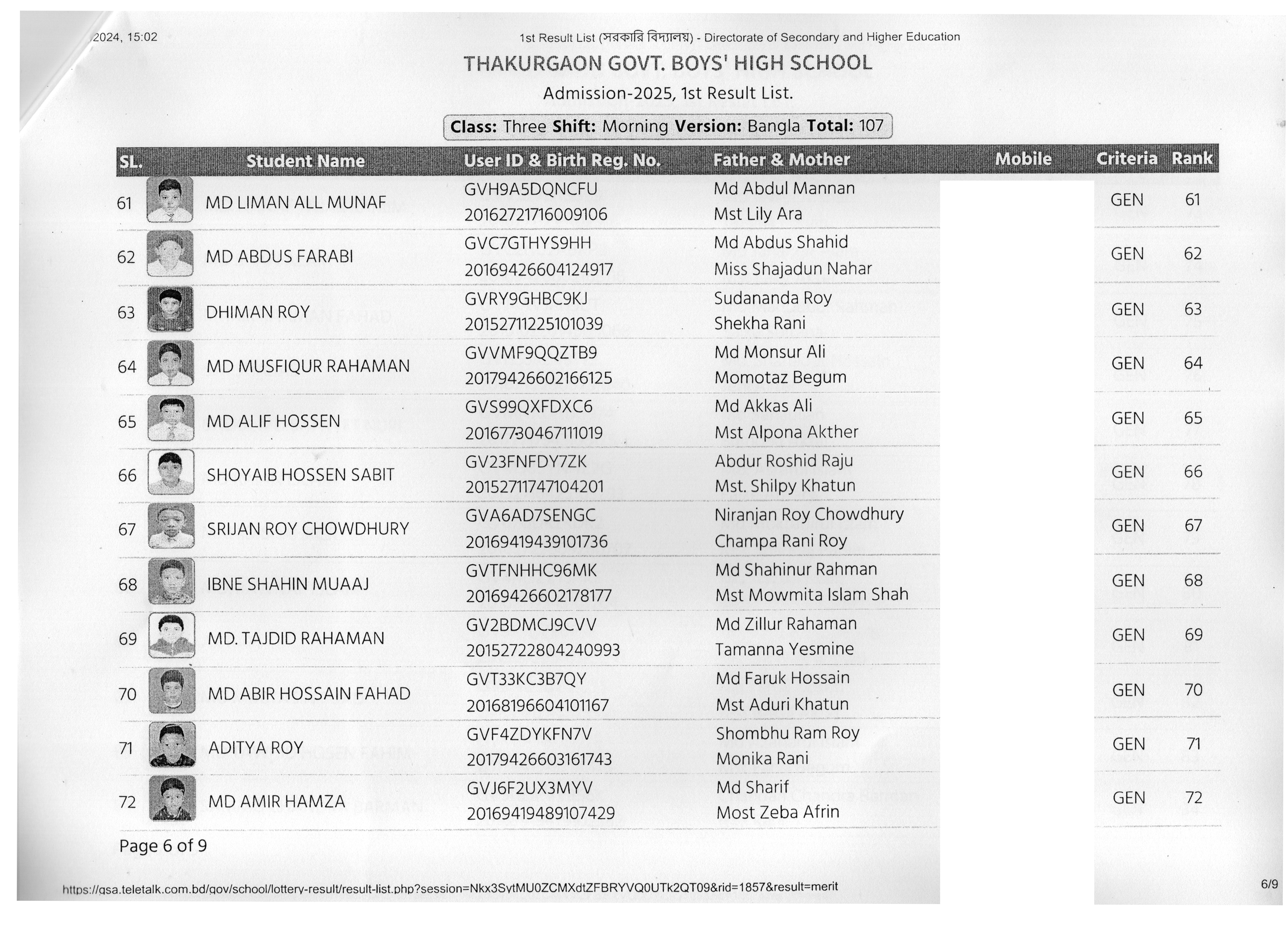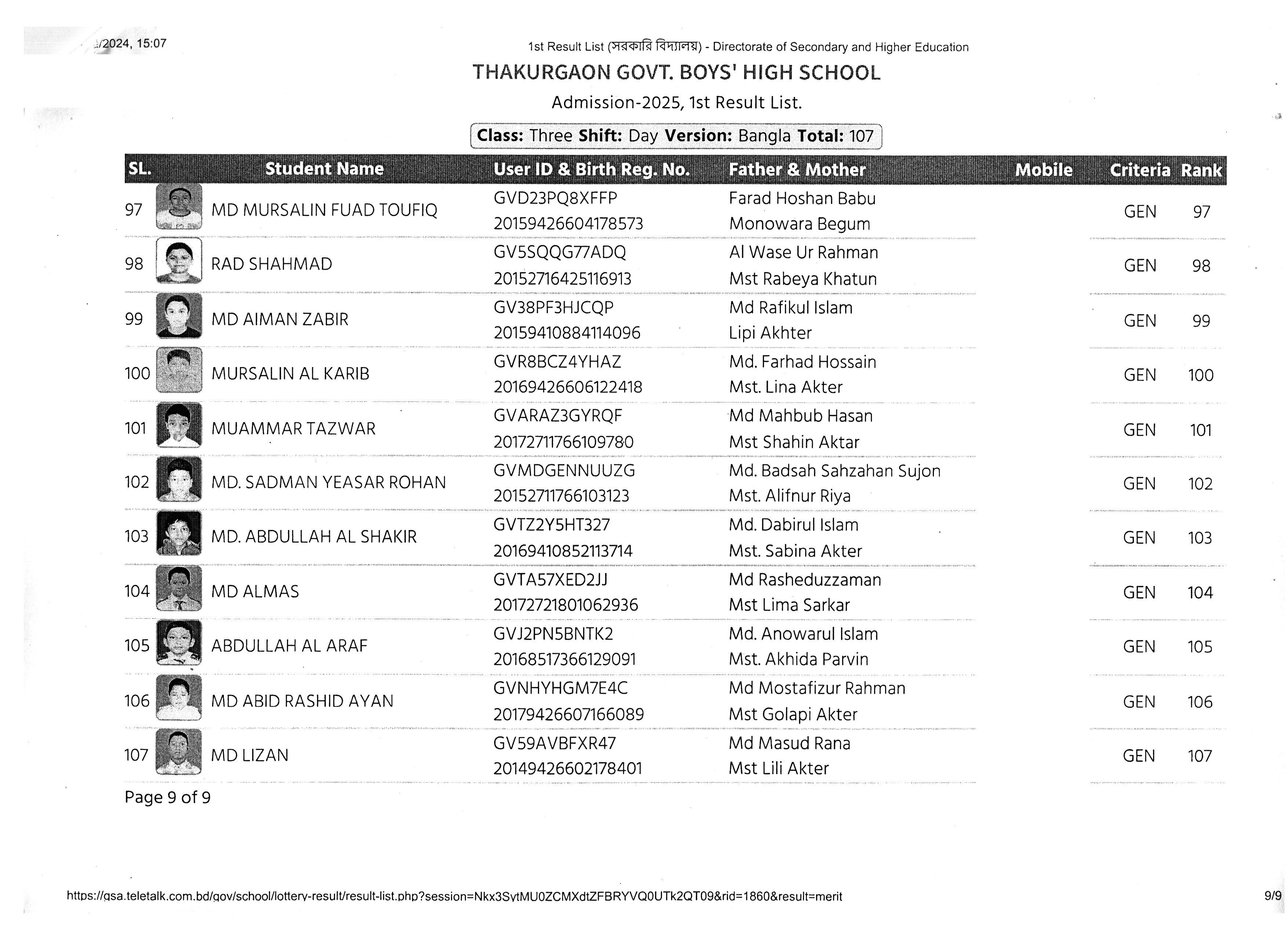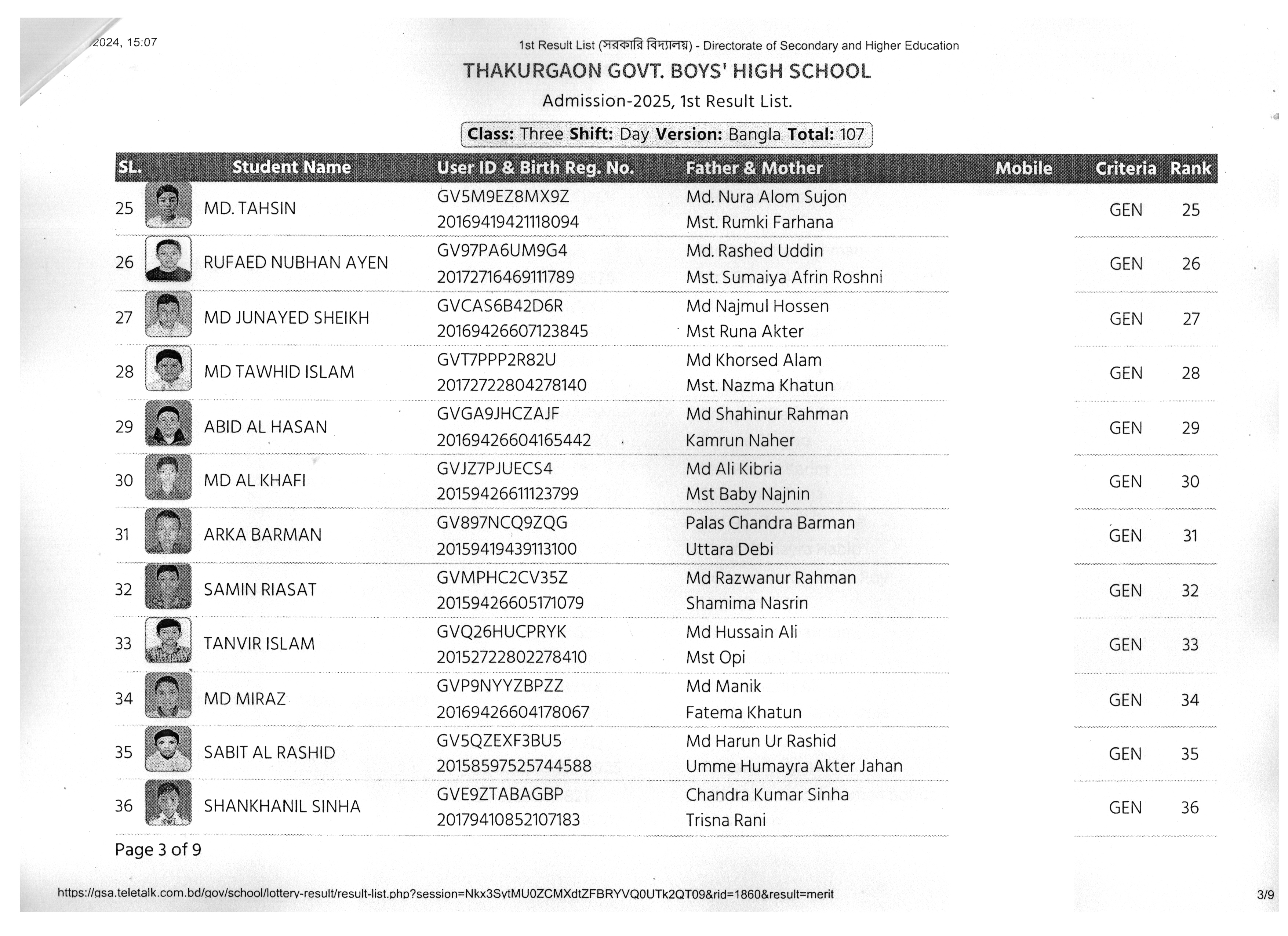 ২০২৫ শিক্ষাবর্ষে ভর্তি ফলাফল প্রকাশের তালিকা (১ম)