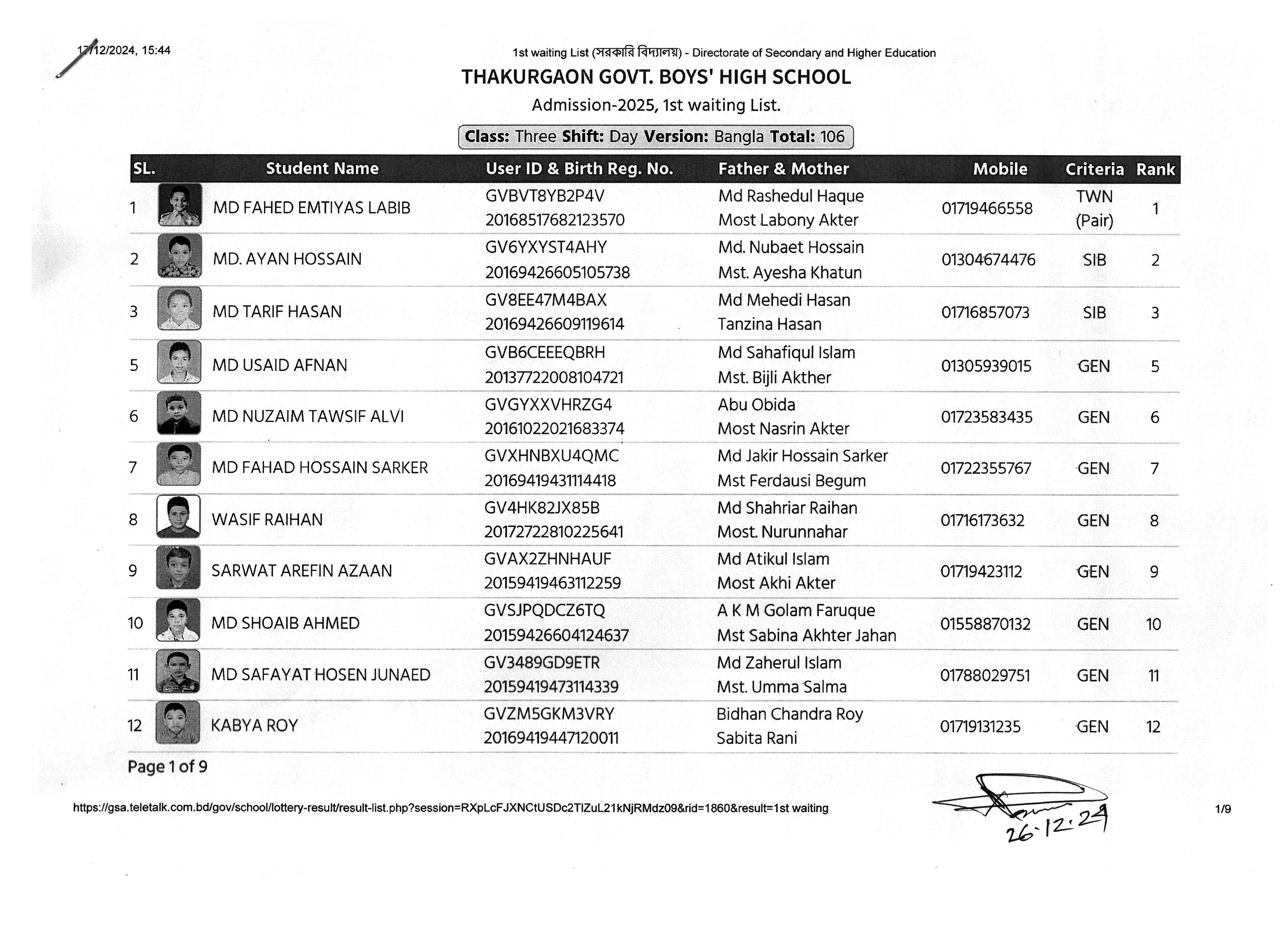 ১ম অপেক্ষমান তালিকা হতে নির্বাচিত শিক্ষার্থীদের তালিকা প্রকাশ ও ভর্তির কার্যক্রম সম্পন্ন করার বিজ্ঞপ্তি