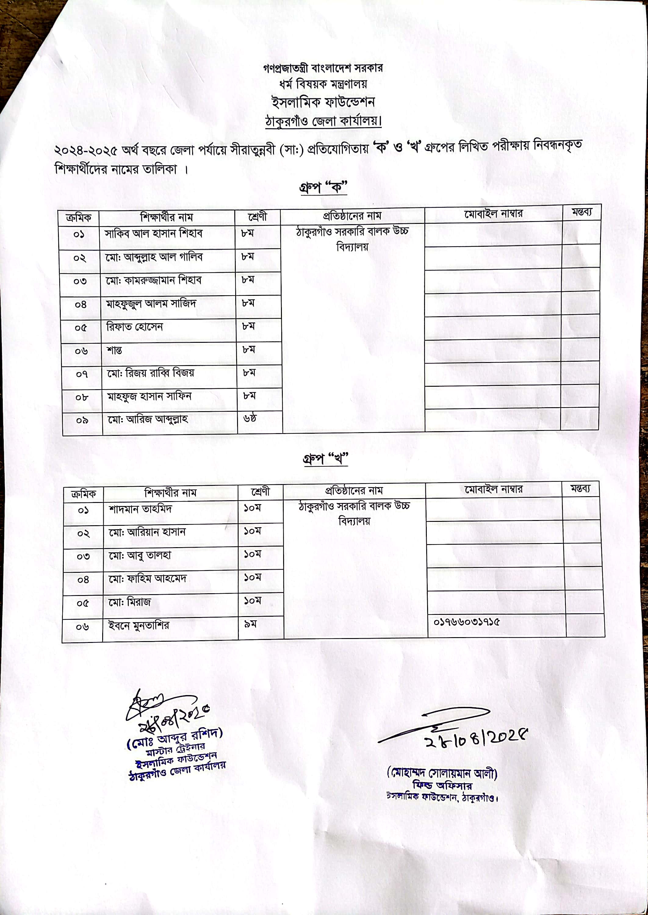 ২০২৪-২৫ অর্থবছরে জেলা পর্যায়ে সিরাতুন্নবী (সা:) প্রতিযোগিতায় ক ও খ গ্রুপের লিখিত পরীক্ষায় নিবন্ধনকৃত শিক্ষার্থীদের নামের তালিকা প্রেরণ।