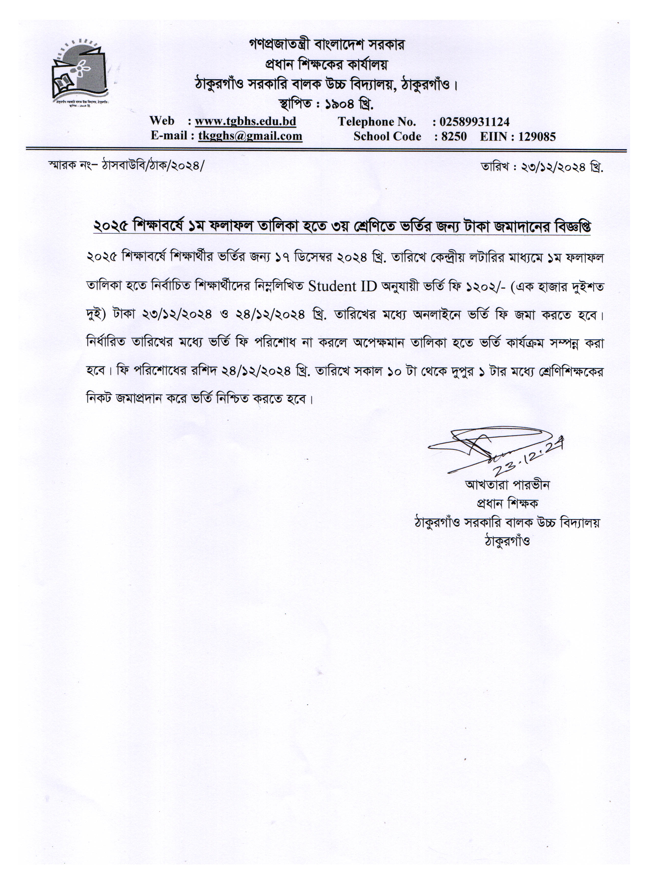 ২০২৫ শিক্ষাবর্ষে ১ম ফলাফল তালিকা হতে ৩য় শ্রেণিতে ভর্তির জন্য টাকা জমাদানের বিজ্ঞপ্তি