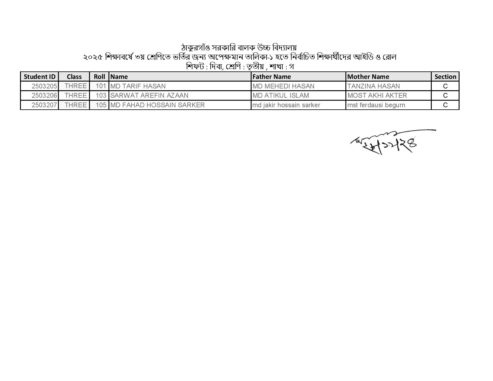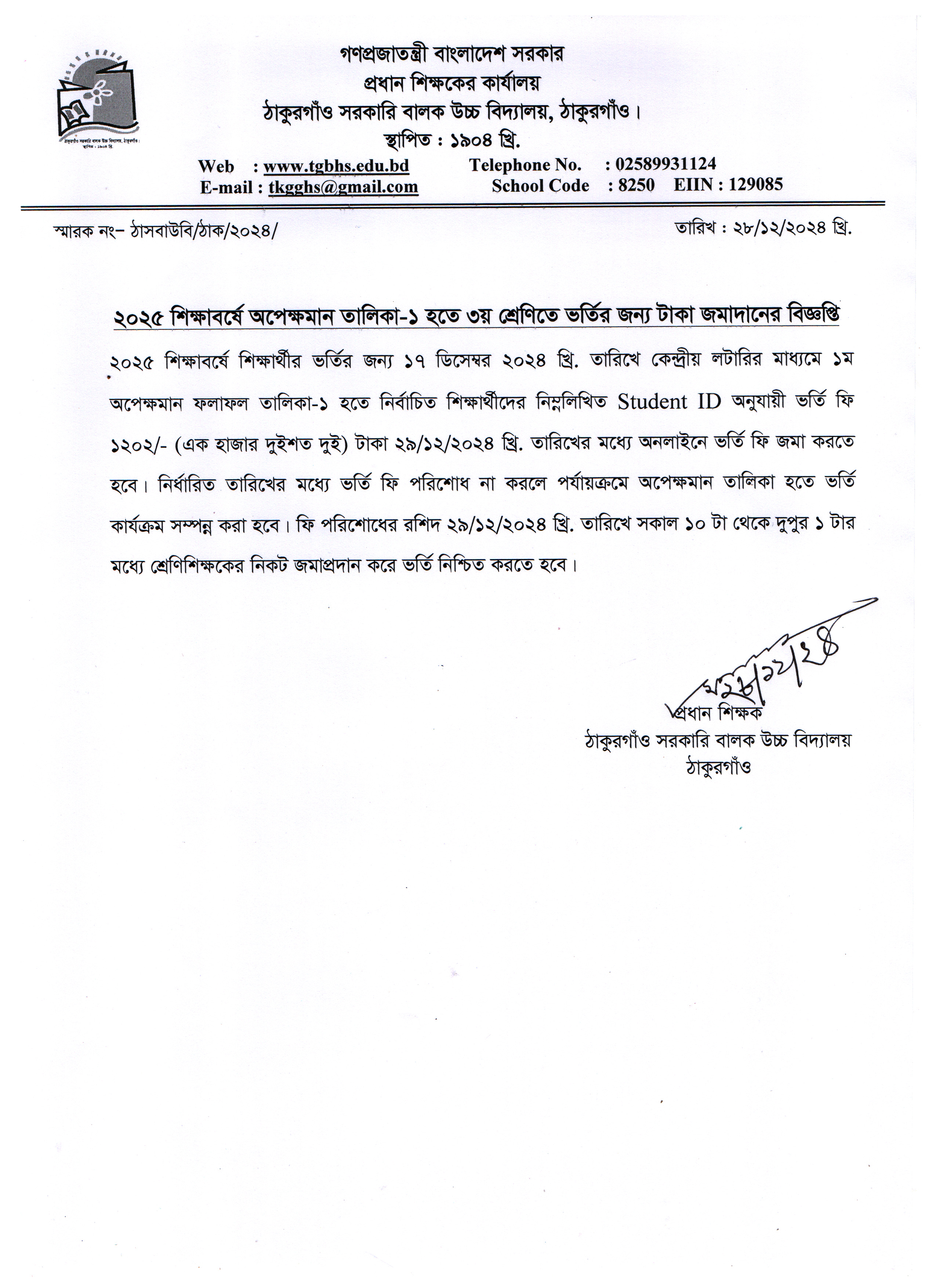 ২০২৫ শিক্ষাবর্ষে অপেক্ষমান তালিকা-১ হতে ৩য় শ্রেণিতে ভর্তির জন্য টাকা জমাদানের বিজ্ঞপ্তি