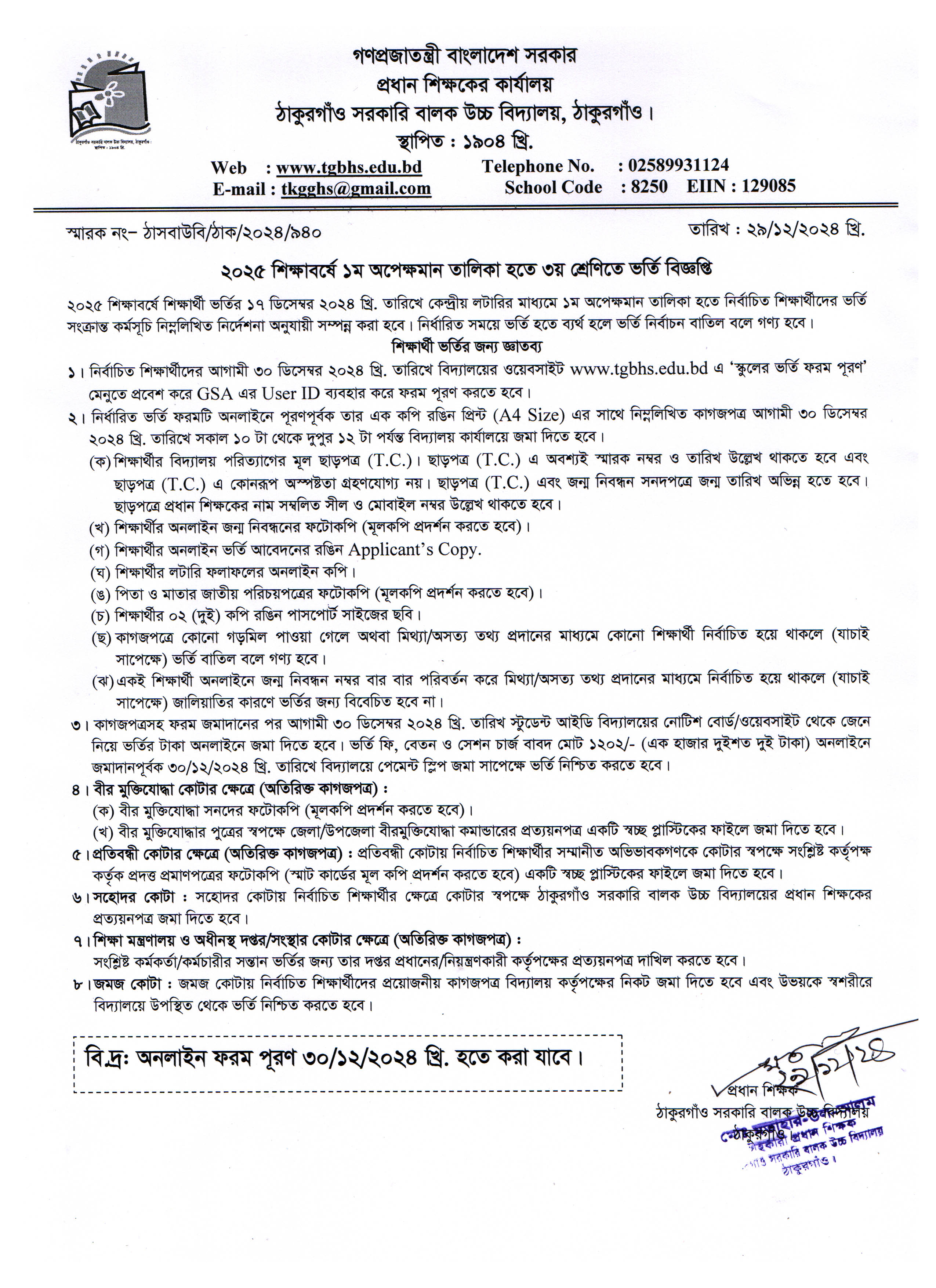 ২০২৫ শিক্ষাবর্ষে ১ম অপেক্ষমান তালিকা হতে ৩য় শ্রেণিতে ভর্তি বিজ্ঞপ্তি -