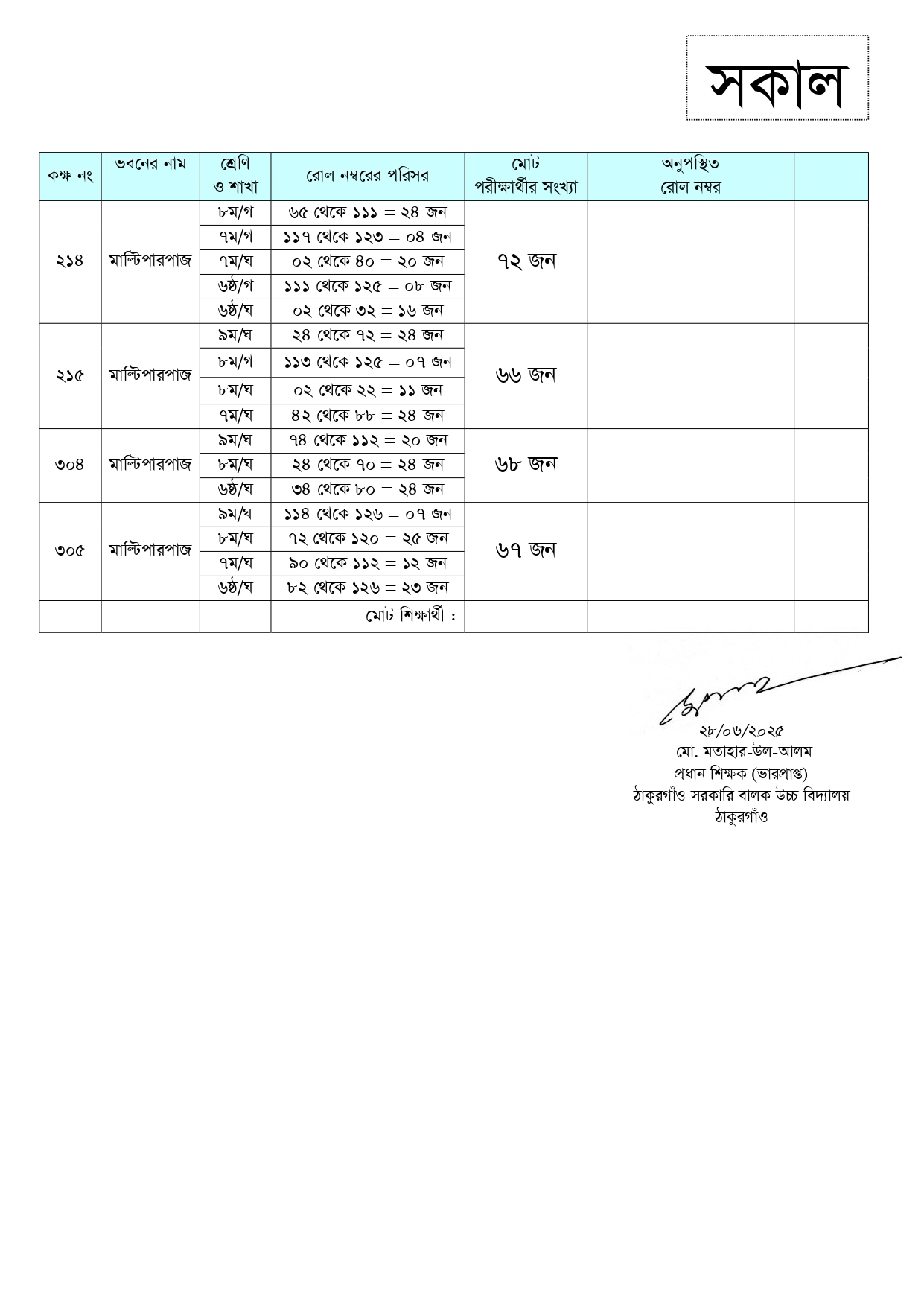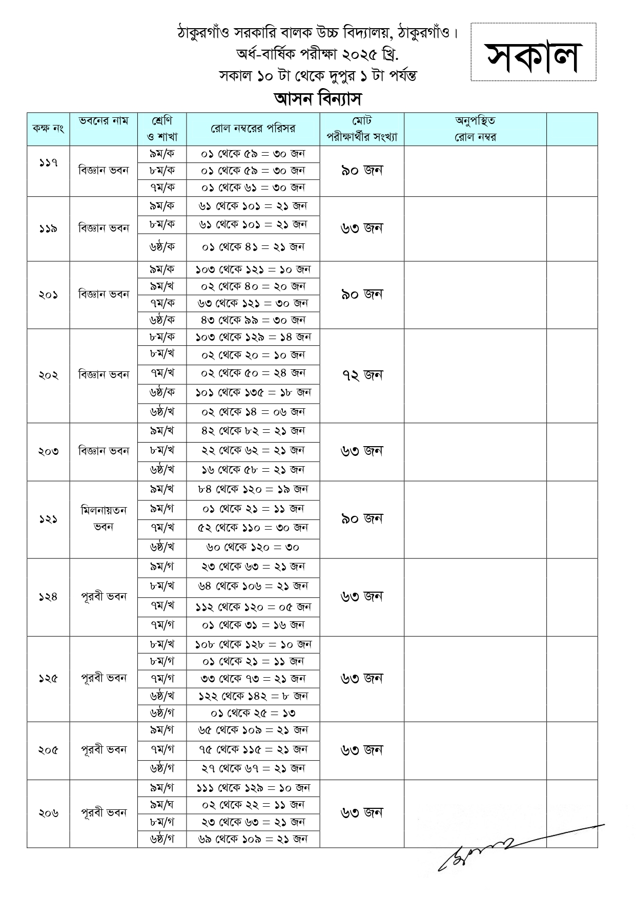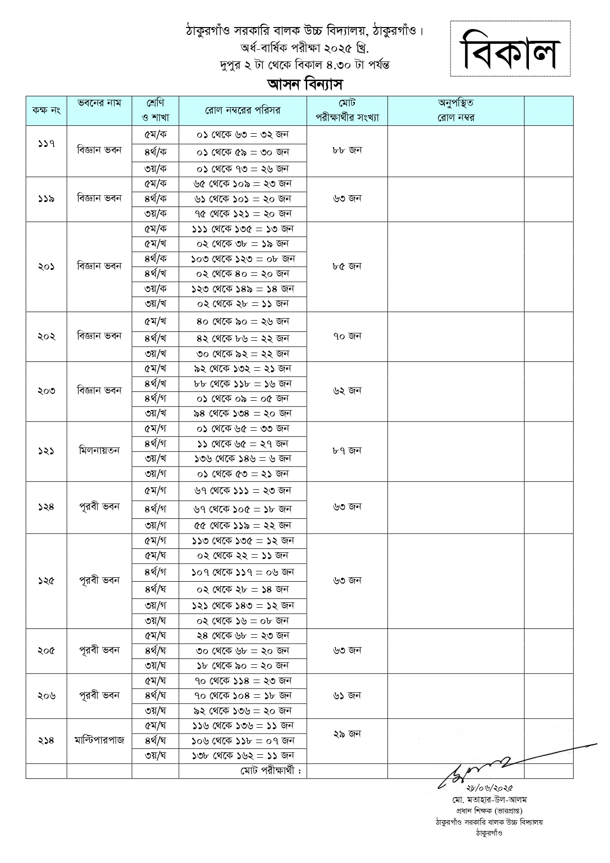 অর্ধ-বার্ষিক পরীক্ষা ২০২৫ এর আসন বিন্যাস