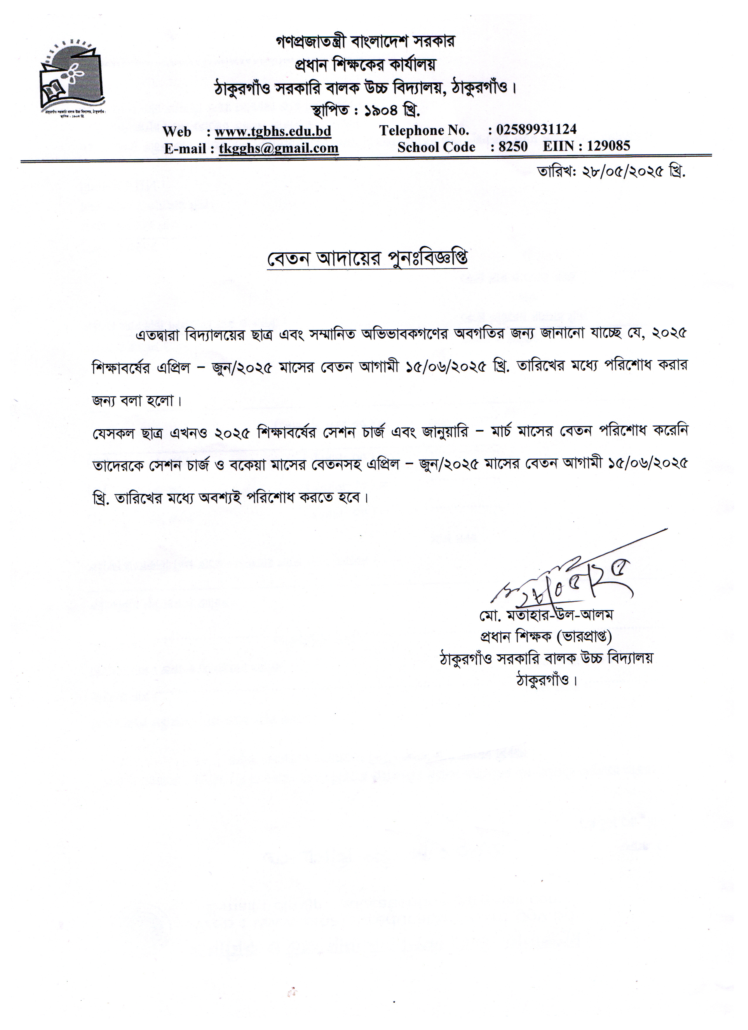 বেতন আদায়ের পুনঃ বিজ্ঞপ্তি