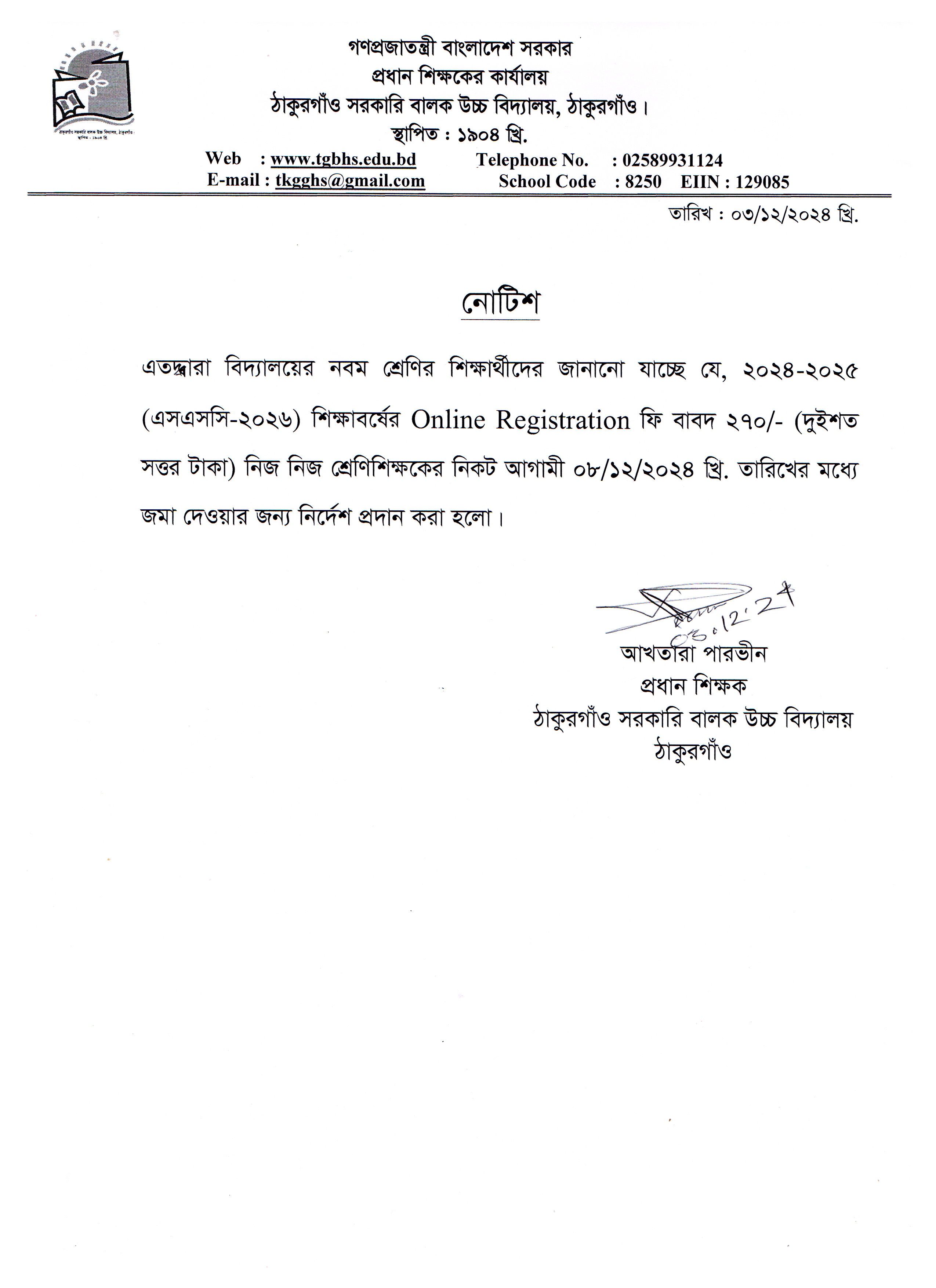 ২০২৪-২০২৫ (এসএসসি-২০২৬) শিক্ষাবর্ষের ৯ম শ্রেণির শিক্ষার্থীদের ON-LINE রেজিষ্ট্রেশন ফি জমাদান সংক্রান্ত নোটিশ
