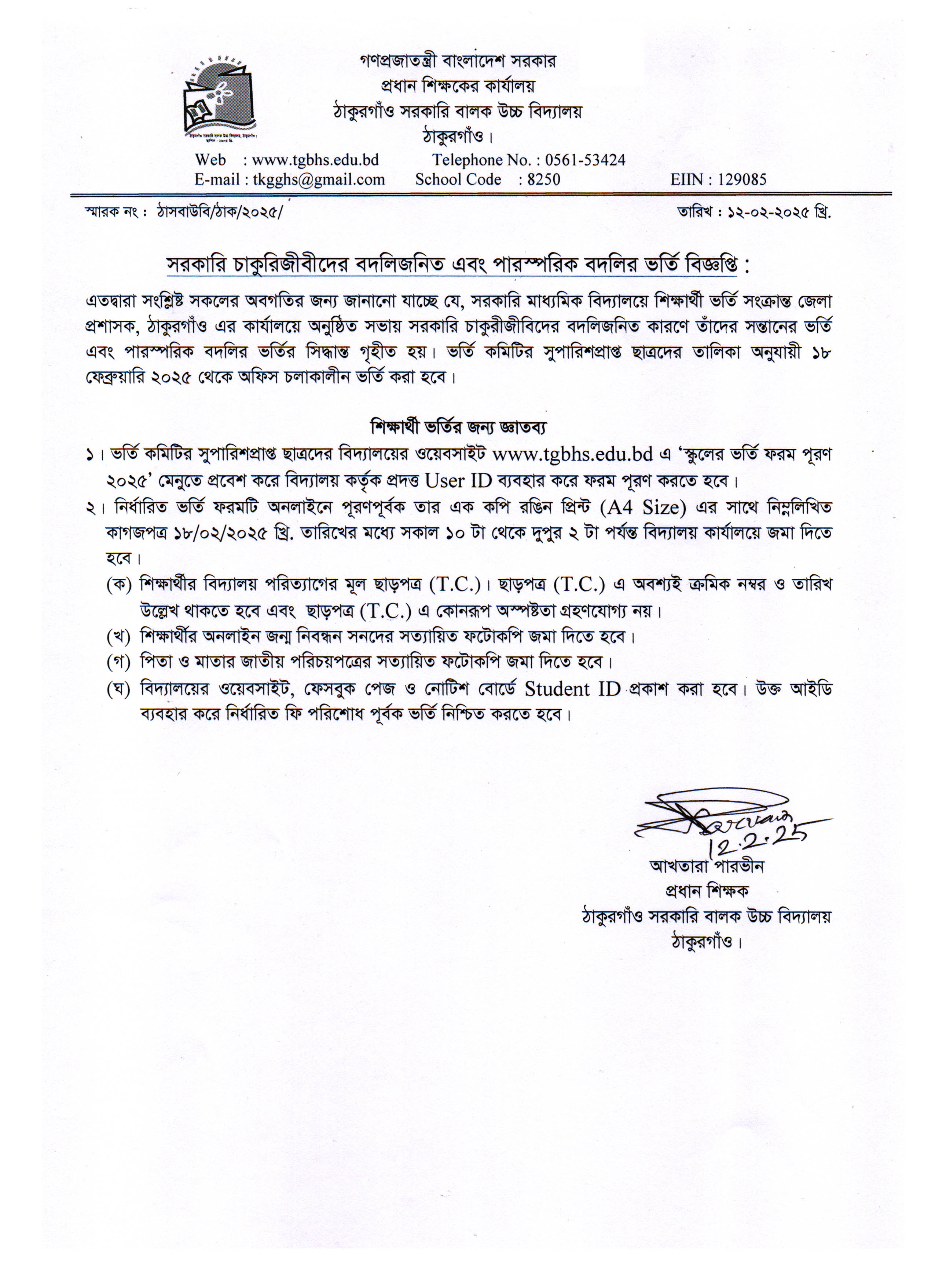 সরকারি চাকুরিজীবীদের বদলিজনিত এবং পারস্পরিক বদলির ভর্তি বিজ্ঞপ্তি